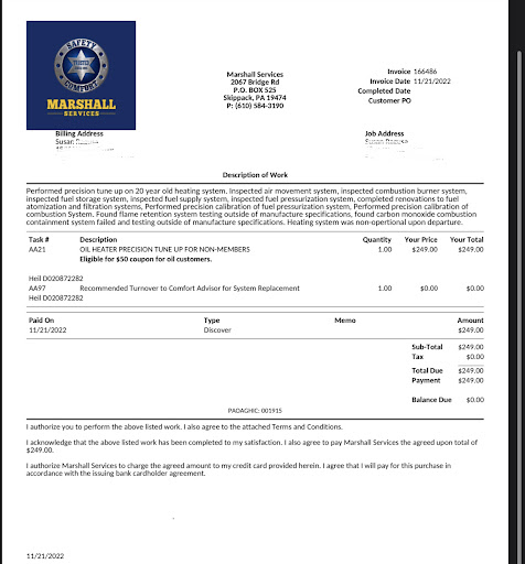 The longer version: I needed to get my 13 year old furnace maintained and inspected (it had been performing very well for the 4 years I lived in the home) and I called Marshall thinking that they were a reputable company. I was paying $249 for the tune up and inspection of my forced air oil furnace (they couldn’t test the air conditioning part because it was too cold, but that would have cost $150 more) which seemed high but fair since I wasn’t a current customer.