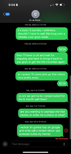 Read moreBeen going for years, but got tired of them lying and scamming me. Last time I went in I got some tires mounted on some brand new chrome 22s for my truck. They put about a 6 inch deep scratch on the face of one and swore up and down they would write me a check and replace the wheel. After bothering them about it for a year I finally just left it alone. They seem like good people and some of them are, but Randy...