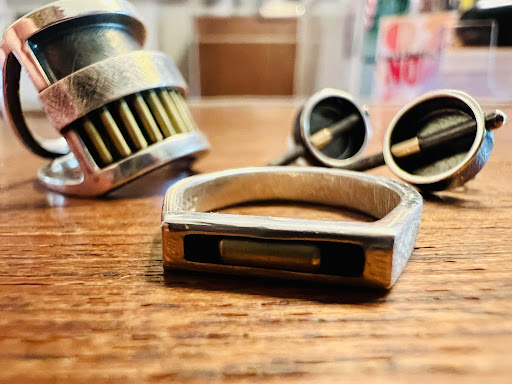 My husband and I had an absolutely wonderful experience at Dana C Fear Jeweler. From the moment we entered her space, we were impressed by her truly stunning, impeccably crafted selection of rings, earrings, bracelets, and more. My husband isn't really into jewelry, but we were totally on the same page when it came to Dana's design because her craftsmanship and the moving parts aspect of her pieces really appealed to our appreciation of industrial machinery. It was my husband who encouraged the purchase of my first ring from Dana, and we have since returned to purchase another ring and earrings that I reach for nearly every day because I so enjoy wearing them.