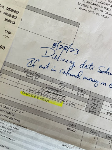 Read moreThis purchase was a nightmare ! Buyer beware, we ordered a custom Barkman table on 5/19/2026 , from Somers Point NJ location, that was delivered today. The day of the order we were told delivery 6-8 weeks and this was noted on our receipt. Week seven I reached out and was told there was a set back due to paint samples. At that time was not told how long after some back and forth was told the set back would be about 4 weeks.