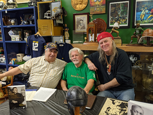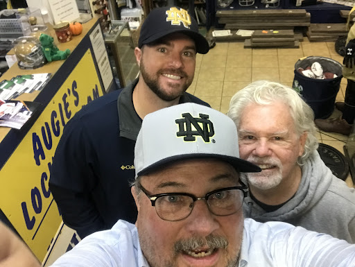 Augie's Locker Room, what a treat. Located at 1811 S. Bend Ave, South Bend, Indiana just East of Notre Dame Campus but believe me when I say it is as much of Notre Dame as you may want in a short space of time. I was there for my first visit of about an hour on Wednesday, April 26, 2021 and in that time was feasted on the nostalgia of the college with a special focus on the football teams and a special light on Knute Rockne. I was there with my author friend Jeff Harrell who has recently published "Rockne of Ages" to do some video for the book filmed by Georges. Our host was in fact Augie and believe me when I say he is one of a kind, knowledgeable and affable, absolutely the person you want to greet you to his place. I will be visiting his...