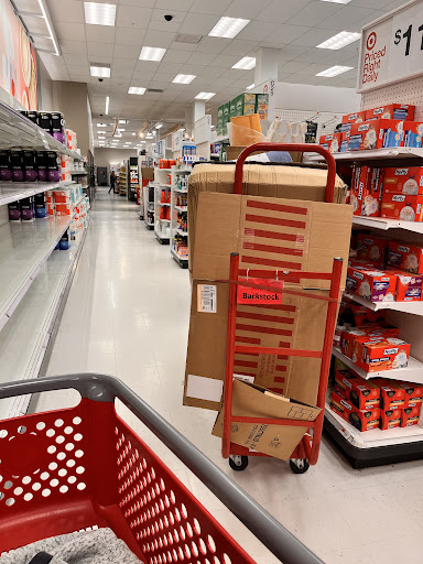 This Target had clothing on the floor. Shelves and tables in the department store area were messy with what little they had in stock. Workers were chatting it up with each other. You feel like you are bothering them just being there, let alone asking a question. A lot of standing around talking. They also are not wearing red shirts and khaki pants, so they are harder to spot. They wear all shades of red shirts, from orange to burgundy, and jeans. They look like customers who have stopped shopping to talk with each other. Meanwhile, boxes of inventory sit there on handcarts. I did see one lady working in the bra and underwear department. She looked unhappy but was stocking the area.