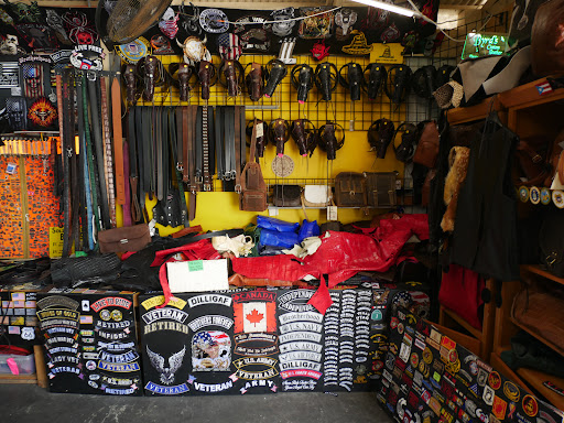 Inside is a long store with items on all sides and in the middle. The reason for our trip was to buy a riding vest for my wife. They had an amazing selection. My wife found the vest she wanted and a back patch, which they sewed on right there in the store. The next week, we went back, and they sewed a bunch of patches on our vests. Again, they did an amazing job. My wife also bought a small and medium-sized leather purse.