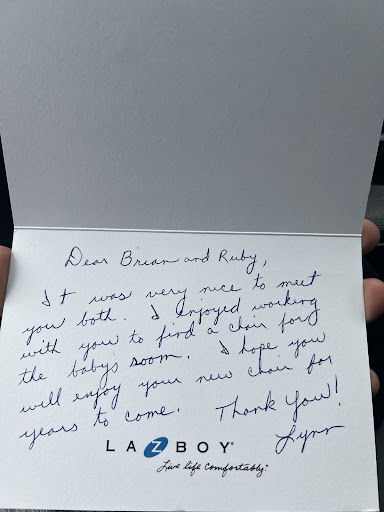 Read moreAlthough we don't have our furniture yet, we've been very pleased with our experience at the South Elgin La-Z-Boy. We started looking at new furniture in November for our new house. We worked with Salesperson Hannah and Designer Denise. We picked out an entire living room set after several different visits.... and then we backed out. We had not closed yet on our new home and decided we needed to put the brakes on the deal, just in case something unexpected happened with our sale of the old house or the builder on the new house. They were very understanding and encouraged us to take all the time we needed. We ended up looking other places in the interim, because let's face it, there are less expensive furniture stores out there. But, after looking at many other furniture stores, we could easily see that the quality just wasn't there and once we were in our new home, we ended up right back at La-Z-Boy. We've had several sets from them and we know and trust the quality. Hannah and Denise were once again very helpful and steered us with their suggestions and expertise to exactly the right set for our living room. We loved the design help from Denise and she gave us some great advise. We ordered a couch, loveseat, side chair, and rug, in the perfect color and design patten for our new home. We are so excited to get it into our house! Can't wait for it to arrive. Thank you, Hannah and Denise! Try them out, you won't be...