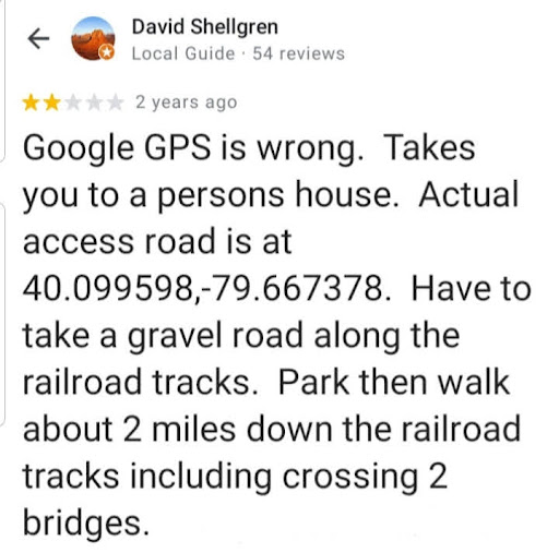 Read moreThe place is cool. It's a small adventure to get there. Do NOT follow google maps. Another reviewer posted the coordinates where to park to get there... 40.099598, -79.667378 (see photo)