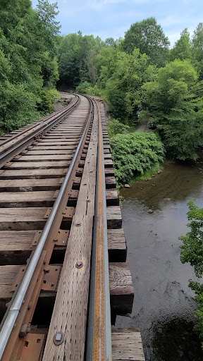 WARNING: On the way to the falls, you follow what is an ACTIVE train track. I was on my way back from the falls when I was about 200 yards from the "1st trestle", and behind me appeared a large, long train. For safety at this point, I go down the hill, cross the creek, and go up the other side. To be safe, do NOT walk across the...
