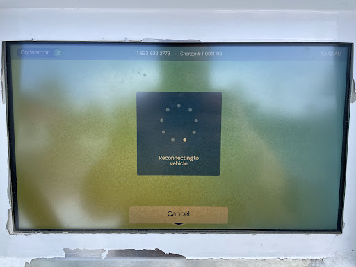 (Second Use): Charger #3 is mostly broken. It displays “Reconnecting” forever, but will still accept a card and begin charging without updating. If the second port plugs in, the first disconnects, meaning even more babysitting. It only charged at 9kW of its claimed 350kW so I gave up.