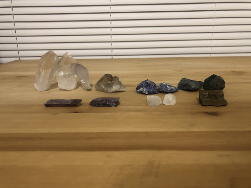 I purchased two Clear Quartz points, an Amethyst point, a Smoky Quartz cluster, two raw Sodalite, two raw Kambaba Jasper, two Lepidolite books, two raw Moonstone, and a Tiger’s Eye. I love each piece so much. Thank you to everyone at Treasures...
