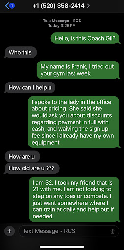 Terrible customer service. I don’t know what the owner’s issue is but even after he was very rude to me over the phone when I was inquiring about the gym a couple weeks ago, I still showed up for a free trial class. I absolutely loved the gym and everyone that I met. The Coach wasn’t available that day, but I was able to train with one of his trainers and I met a nice lady that seemed to be running the gym. Her and I spoke about pricing and she gave me a form to fill out when I was ready to join the gym. I reached out to Coach Gil today to talk about the pricing discounts previously discussed with the lady, and he basically told me he didn’t want my business. I feel discriminated because of my age considering he was more concerned about that when I talked to him over the phone and thru text. My money is green just like everyone...