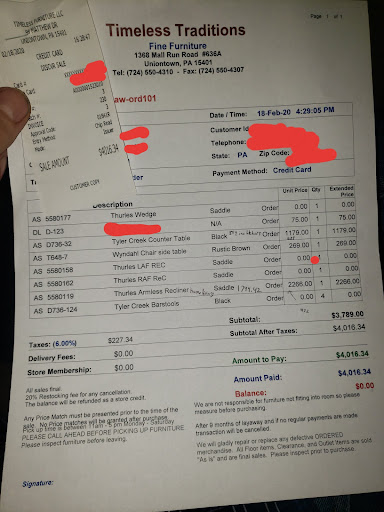 All in all I paid $859.59 more than I could have had I bought the furniture online. The difference is I could see, and feel the product's in person before making a decision. The sales person was extremely knowledgeable, friendly, and helpful, and patient. He brought consideration's to my attention that I wasn't even aware of. Did I get ripped off? Or did I pay for the experience and insight I was offered? I was happy enough with the service provided that I was willing to "pad the coffers" a little bit. They do have more overhead than a website does. When you guy's are making your purchases, ask for Dale, and research the product's. Getting it for below sticker price may not necessarily be the best deal you can get.