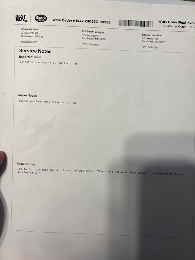 So not only did geek squad southaven lie and say my CPU was fried they also stole important parts from me. I wonder how many people just cough up the money for parts they say are messed up when they aren’t really messed up. This is 100% a scam they run regularly where they just get the okie dokie and steal peoples working...