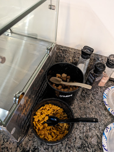 THE FOOD was pretty good. My wife and I got a 12" three-topping pizza. The toppings were hidden under the cheese to ensure the toppings stay in place (which is exactly how I make my homemade pizza.) The ingredients used were high quality. The cheese was good. The dough was not soggy and had the correct consistency. Not bad pizza. We also ordered 12" cheese bread with both marinara and ranch. Their ranch was most likely hidden valley ranch, which went well with the cheese bread, but the marinara went a lot better with it in my personal opinion. Not bad.
