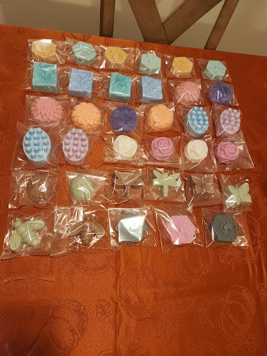 I made 10 bars of soap and put them each in a little exfoliating bag. I chose my own fragrance and color for each bar of soap. They will make great gifts for my neighbors and co-workers for birthdays and Christmas. They had some masculine scents, so I've got gifts for males and females. My favorite fragrances were watermelon-lemonade and eucalyptus-spearmint. It was a great activity and very reasonably priced. It takes about 30-60 minutes to do depending on how many you make. My adult son made a large container of body wash and bought a massaging...