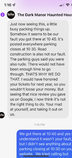 Read moreIf I could give ZERO stars I would! I will give them an A for effort as I know it is very difficult to please everyone that comes to haunted attractions, however there needs to be many things addressed at Dark Manor. First off I am very traveled in seeing many different style haunts around the country and I definitely offer my insight and ideas to several of them. My critique is this...