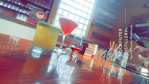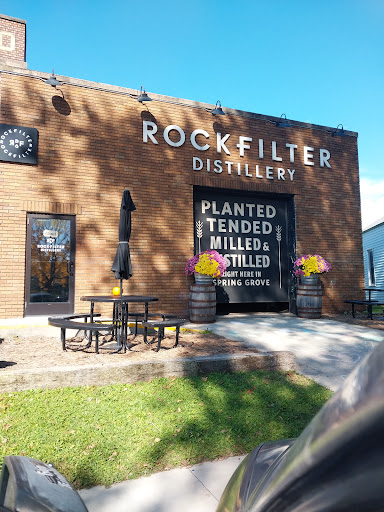 Saturday I was on a brewery excursion...starting @ Fat Pat's in Spring Valley....as I chatted up beertender Harley, we got on about whiskey and Old Fashioneds.... She mentioned "on the other side of the park is RockFilter Distillery, I sometimes work over there". I excitedly replied: hey I'm pretty sure I follow them on social media (gets out phone) "yes" they open at noon... it's 11:52, annnd the stars have aligned! Thanks as I was brewery focused!" So... I drove the two minutes around the park, from parking spot to parking spot to check it out. Parking was easy right out front along the curb. They had a windowed garage door they opened & a few tables & chairs about. I didnt know the fella i met as i came in was the co-owner/distiller! As i made my way to the bar, two gals working. I thought i heard one say to the other "mom"... no way, im crazy. Sure enough when i asked what she drinks? "Im not old enough, these are my parents." Solid!! I love a family run, local, small business!! Co-owner Kate did a FAB job explaining the tasting notes of the several drinks i inquired about!! I went w the Honey Bourbon. It was delicious but i opted to have what i came in for; an Old Fashioned! After, of course consulting Kate on whether she'd go w an Old Fashioned or New Old Fashioned? Its a cute tasting room. They have several bottles on the bar. I didnt see a couple bottles he referred to but i LOVED when he said it was his grandparents picture on the Rail Splitter, his uncle on a tractor on the Red Rider Rye and his great uncle on another!! How fun!! Rochester brewery Forager takes barrels after hes used them! I really like the old pulley above the bar for the lights. The old pipe as a bar footrest. I really liked the river bar top! For...everything ive mentioned; RockFilter is a must visit; err must imbibe. Chat up the owners. Take in the....history(?) ... story of RockFilter!! Thanks for an informative & delicious spirits stop in between...
