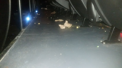 My husband said after 3 min of us going in someone came in to "clean" the theater. It was discusting the amount of trash in the theater. All he did was go down two aisle and picked up a popcorn bag. I came back in from the restroom and took this picture AFTER the cleaning guy left.