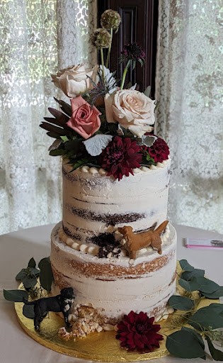 My naked cake consisted of a Almond cake as the bottom tier and a chocolate cake with raspberry filling as the top tier. The cake WAS AMAZING. It tasted so amazing that we actually almost didn't get to take any home. We had to ask the venue to please cut us 2 pieces for us to eat that way we could enjoy it later because our cake was gone! We had 41 guests and the cake was all eaten. I had a guest later confess to me that he ate 5 slices... it was that amazingly delish! She was awesome to work with. Went over everything with me before the wedding. Thank you so much for everything! (Please note! The dogs on my cake I provided for her! Also the flower top was put on after it was delivered by my...