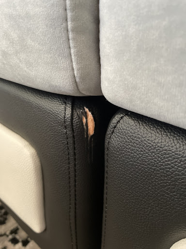 Now that my couch is falling apart, they are refusing to take accountability, claiming the damage is from “external factors” rather than acknowledging that the material is not real leather as advertised. They claim this part of the couch was never supposed to be real leather, but this issue is occurring all over the couch. This part of the couch is damaged because the electric recliner doesn’t align to the back correctly (my family is all under 150 lbs, so certainly not a weight issue). We don’t use the recliners too often, so this damage over such a short period really shows the poor quality.