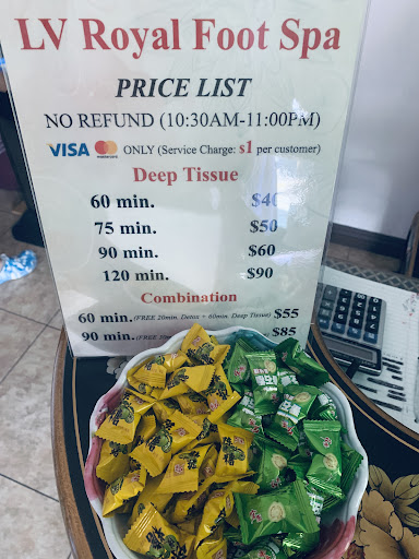 Could not have been happier with the experience. Had a lazy Wednesday afternoon and got mani/pedis. I almost never go for these simply because it is just so quick and easy to clip my own nails. But every now and then, it's nice to get the professional treatment which gets your hands and feet looking and feeling really good. So, after the mani-pedi, we felt like continuing the experience with a massage. The lady at the nail place recommended Royal Foot Spa on Spring Valley. We opted for the one hour foot massage for $20. I expected to get a half-hearted half-hour foot massage. What we got so far exceeded our expectations. Awesome hour included full-body massage (pants and shirt remained on), and it was all excellent. Very well done. Don't expect the W. But do expect a very comfortable experience. Our massages were in the same room at the same time. I believe there were 6 large, plush chairs with ottomans that morph into tables . Very soothing music. Massage oil. Aromatherapy. I saw a post complaining about having to tip. Come on. This was worth SO much more than $20. We tipped $10 apiece, which I really felt was not enough but seemed more than appropriate for a $20 price point. Expect to tip $10. It's the right thing to do, and more than worth it. We are already planning our return trip. At this price, I'm thinking weekly. Enjoying hot tea now - seemed like the thing to do....