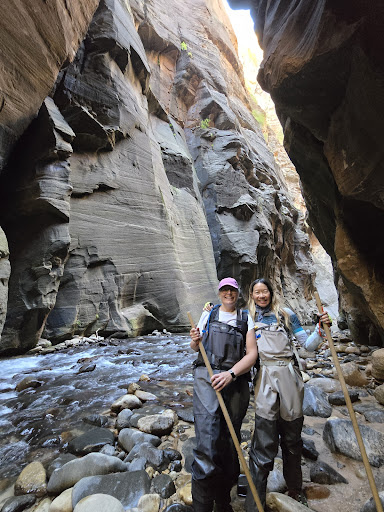 Read moreWe LOVED the waterproof bibs/boots/stick package ($59) for keeping us warm and dry for hiking Narrows, add ebike for $79 (then take 10% off for bundling 2 together, and add $20 for early pick up) but my friend's bike battery BARELY MADE IT BACK, she had to pedal her brains out instead of enjoying ebike pedal assist power. Very disappointing for her first ebike experience (she's an experienced cyclist) and staff only shrugged (did you make it back? You're ok then). Shabbier crappier bikes than other outfitters and the pedal assist isn't the smoothest (totally jealous of fellow traveler's sleek ebike from Zion Peddler whose chill owner let him have it overnight without extra charge, although pricier, $100/d). Recommend getting ebike elsewhere other than Zion Guru but their water gear experience was superlative. Keegan gave great eyeball sizing and best orientation/pep talk: Have fun and don't get so focused on how far you go that you don't enjoy the magnificent scenery. Well said wise guide! I would definitely recommend not just getting the shoes and neoprene socks, that water is cold and it got up to waist/chest deep! Maybe if you go in summer that would be sufficient. Or if you don't plan on going far. We went for 6 hours in October we were grateful for our gear that was cozy and comfy. Best experience doing the Narrows with their gear but get your ebike at a dedicated bike shop (although a family said they needed a child seat so they reserved with Zion Guru). It was convenient getting the stuff all in one place though. Loved the stick holder and cargo basket. Nick and Maddy were also super friendly and helpful getting us situated on bikes and mandatory 10 minute ebike video very informative on what to expect. Other travelers we saw rented from Zion Adventurers which was a bit cheaper, $120 for same bundle and they loved the gear which did look a bit newer. But every guide book recommends Zion Guru, they do seem great on the gear side, helped make our once in a lifetime experience...