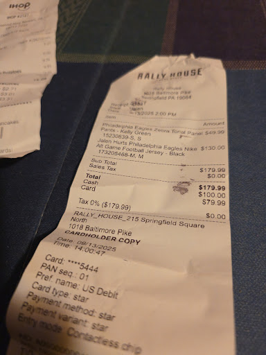Read moreGood evening Google Family. This was my very first time shopping here. They have any and all Eagles merchandise and Phillies merchandise. The place is huge!!! I did not purchase anything because I wanted to see what they had first. What they have is Everything and I mean Everything. Rally House did not disappoint. I was looking for Eagles leggings and I found them. I will come back here another time and shop this time. I love this store. Truly a FIND!!!! A wonderful shopping experience, Thank you Rally House!!! I went back today and purchased Jalen's jersey plus Eagles pants. Shirt was $130.00 and pants $49.99. Nothing is Cheap in this store. Charles was the associate who helped me. I try before I buy. Everything fit nicely. I needed a small in the top. No small but a medium for the shirt and I found a small pair of pants..God is so Awesome 👌 I enjoyed my experience here and I would return. Good night Family, workout, be healthy, fit and Fabulous. I am going tomorrow to a sports bar to watch the Eagles play the Chiefs so I...
