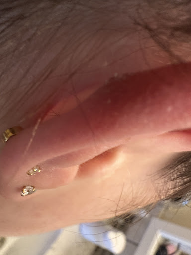 I came by without an appt and didnât have to wait too long. When it was my turn, I picked out my earrings and was a little surprise by the cost of the require cleaning solution since it wasnât advertised in the âfree ear piercing with purchase of earring.â It was fine, I paid and moved on to the piercing. During my piercing the first side went fine, the other ear got stuck in the piercing gun and hurt sooooo bad, I could barely stay still while she got it to detach from my ear cartilage. She (Nixie or Noxy, or something like that) did not apologize or seem to understand and how much she hurt me. I left afterward and for the rest of the night both my ears hurt but especially the one that had been pinched. It was swollen and there was clearly soft tissue trauma. Because they were hurting sooo bad, even though I knew it would invalidate my warranty, I had to take them out of my ears. Thatâs when it became clear to me why they were hurting so badlyâŠI had purchased 14K yellow gold earrings and these were clearly not. The earring and post were gold but backing was obviously sterling silver, which I had told her I was allergic to. However, if I had followed the rules and not removed it, there would have been no way for me to know that.