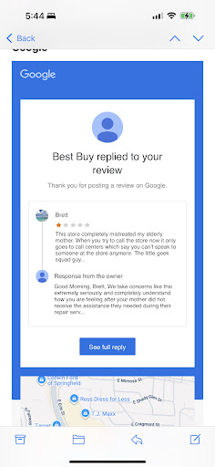 Read moreRecently my wife ordered a good from this company and somehow they still had her old address saved in their system. We've had other items ordered since we lived here that had no issue arriving here so this made no sense. We contacted them as soon as we noticed the error and they told us they couldn't do nothing once it was shipped out on the truck we'd have to call the courier. This was a same day delivery so it was plausible. We did who pretty much told us the opposite contact best buy because they can't change anything there. The effed up part is we got and email more than an hour later from the courier saying they just picked it up from Best buy..but if it wasn't already shipped out why were we being told otherwise? Half this could be blamed on the courier Shipt as why did their system also reflect it was out for delivery. Either way..They ended up delivering to the wrong address which of course means I'm likely just out the good and money unless a good honest person, perhaps a resident at the house, manages to find it and returns it. Not likely here in Springfield for sure. You're getting a 1 star because of it wasn't already shipped something could be done was the impression I got and then seemed like you beat around the bush and give us a runaround dragging your feet to do anything until it was shipped and I really couldn't do anything. Why isn't there a way to stop these transits? Why isn't their a way for you to simply contact them and have it rerouted or returned even? We were happy to accept we made a mistake and take the hit if necessary and responsibility if we had just simply missed a window where something could be done but getting that email from the carrier we'll AFTER we tried unsuccessfully to get it changed or stopped before, and a delivery email another hour later at the wrong address is just one surefire way to p* someone off. I did end up going to this address which of course they had no idea of any packages as they just got home according to them. So they either took a free gift or someone stole it off their porch who knows. One things for sure. I won't EVER use your same day again, and for most items you might sell I can get from somewhere else that has ways to prevent this..I most certainly will be using them instead. Buyer beware double and triple check before you get something sent especially by same day even if you've had recent successful deliveries. They can't or...