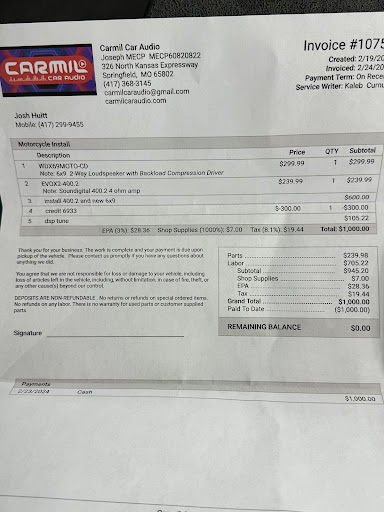 Read moreAfter spending $4000 in parts and labor I had to spend another $317 at a dealership for cracks, unplugged tubes and missing bolts. I have pictures with dates on the entires experience. On the way back a front speaker went out. The sound quality was still not where it needed to be and it was recommended I spend more in equipment and labor. I was also charged a 2nd tuning. Then a day later a rear speaker blew. I had to come up a 3rd time because the sound was still off. As well as a speaker falling out. I got a 2nd opinion because this was just not sounding like a lot of other bikes or good and balanced. So I then communicated I would be going a different direction. A new shop pointed out the speakers had been cut down to be crammed in and also holes were jammed up against the speaker grill in the front. The saddle bags were drilled incorrectly right thru the bag and not sealed or routed, just left the wire un neat and in the way. I tried calling and was told carmil was busy and would call back 4 different times and I finally just stopped in. Carmil kept 20% of all equipment upon return which I don't see as a term on any of his paperwork or receipts. After he reassured me numerous times in person he just wanted to make it right and that he would take care of me. I also caught that I was charged a credit card fee on a cash transaction.