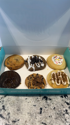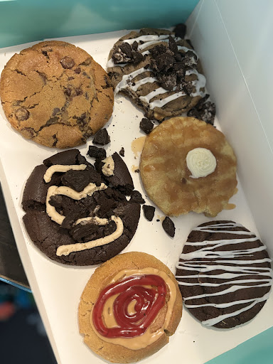 Read moreMy daughter and I stopped in late on a snowy night when not many people were out and we were welcomed with a smile! The smell of the buttery cookies slams into you as soon as you cross the threshold. I love the concept - cookies filled with goodness! I have issues laying $6 for a regular cookie - but these weren’t regular. We tried the cookies and crème, wedding cake, peanut butter and fudge and the fudge/marshmello one and oh my they did not disappoint! They were sensationally crispy on the outside and comfortably soft and warm on the inside and omg the flavors!! The cookies and crème was our favorite followed by the peanut butter and fudge. We got 3 cookies and the total was just over $16 but man was it worth it. I cannot recommend...