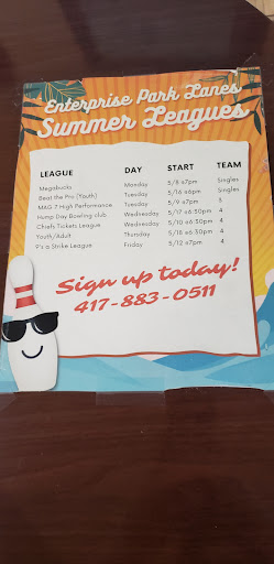 Read moreThis is the most ridiculous place I can't believe this the price for bowling just for myself is unaffordable and unacceptable I've been bowling here since 1994 and I live in Branson and I sometimes don't bowl often it's been 4 years or so since I've been to Enterprise and I was just here and I can't afford an hour for 0ne game of bowling it takes me about 4 or 5 minutes a frame and my ball was in the ball return several times for a few minutes before it was returned.i only got one game barely and I was hurrying to complete a game in 50minutes so I won't be returning here ever they just lost my business and hopefully this place goes out of business I hate enterprise lanes and the Employees are rude and not helpful and very condescending unprofessional this place needs just to shut its doors and make people happy by not having to bowl here anymore and put up with it's ridiculous unprofessional staff I sincerely hope this place shuts down and goes out of business worst experience I ever had at a bowling alley So don't pay just when you walk through the doors and see the price just turn around and walk away and save your money cuz it's highway robbery everybody is getting robbed of their hard earned money so...