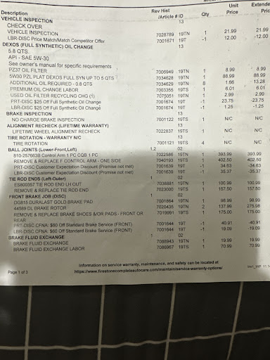 I dropped my car off at this location many times over the years. The past year I haven’t driven as much. I dropped my car off on 10/8/24 for breaks and rotors, a wheel alignment and oil change. They called me and said they did a full vehicle inspection for free but on the receipt I was charged $9.99. However, they contacted me to tell me I needed ball joints and tie rod on left front. The work was quoted at $2400-$2600. I told them o did not have that kind of money and asked what could wait. The spanish looking guy who called me seemed angry with a bad tone yelling about how everything needs to be done. After I explained that normally they would tell me what needs work today and what can come back later he started talking about all these discounts and the brake brakes can wait. Now the price is $1819 for oil change, 1 ball joint, 1 tie rod, and both from breaks and oil change. I believe this was way too much for this work that I’ve had done before. I picked up my car on Thursday evening 10/10/24 and I made 2 stops on the way home which is 6.7miles. I pulled out of my driveway on Saturday 10/12/24 and noticed a small puddle of what looked like oil in my driveway. I thought maybe it’s not that big a deal, then on that following Wednesday 10/16/24 I pulled out the driveway again and the puddle was just a tad bit bigger. On 10/18/24 I pulled out to go to my second job and the puddle was even bigger. On 10/19/24 the puddle was huge so I contacted Firestone in Springfield and was told my gaskets could be bad. I proceeded to go near Firestone for something else but the car started putting hysterically and the car was smelling like fish and I had no AC any longer. I lifted the hood when I pulled over and it was oil leaking out the engine it seemed and sprayed all over the inside of the hood. I immediately took my car to them. I get there and ask why my car would be doing this and the Spanish looking guy again said that the gaskets might be blown. Then I said why wouldn’t you detect bad gaskets if you did an overall inspection. Then he tried to coerce me to agree “to get into a mind-set that it happens”. But I was not buying that because I told him before I couldn’t afford $2600 of work and I believed they did something to my car to get me back there for more work just to keep charging me more money. After about 1 hour this guy calls me back and says “you need a new radiator and condenser totaling close to $1500 of work”. Now I’m trying to figure out how I go from gaskets to a radiator and condenser. Then he goes into saying that I must’ve it something and I told him I did not because I work 3 doors down from my house and I work to work my car barely moved the entire week. Then he went on to say someone else may have access to my car. He was laying it on think. So I told him no one else has access to my car because I carry my keys with me everyday. Then he tries to blame the issues on the front bumper damage which I had on this car since August 13, 2022 and they have done oil changes and work on my car since the. And never have I had any issues with my radiator or condenser. I believe these people destroyed my car all because I refused certain work so that I could afford the most critical work back on 10/8/24 when I initially dropped off my car. I will be contacting the BBB and Consumer Affairs because these guys even Kennis were names in several bad reviews I’ve already read. Now I can’t even drive my car and it was driveable and not doing any of this prior to me dropping my car...