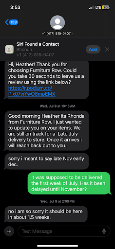 We all moved to the area from out of state. They recently purchased a home and had to start completely over furniture wise. They chose to do business with Furniture Row at the end of April and unfortunately I was not able to go with them. Their salesman Cody told them it’ll be in the company’s hands in around two weeks but “we always say a month to be safe”. Except for their custom ordered couch.
