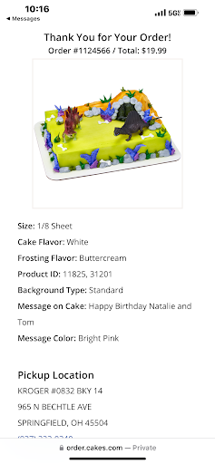 Read moreSo mad! 😡 On the left was what I ordered, only modification I asked for was for the purple leafs to be pink instead. I ordered this on Sunday. Not once did I get a call/ voicemail/ email or text discussing any other changes. I did receive the plastic dinosaurs to go on top but still. These are TWO entirely different cakes! It looks as if they forgot to make it, took a plain one trimmed in pink from the case, slapped a digital print on it and a few extras and called it a day. Not to mention having to wait five minutes to pick it up after the scheduled pick up time, which typically I don’t mind to wait. But to wait for THIS! Unfortunately I called everywhere else and obviously no one could get anything done by the birthday party. This was for a two year old and she literally stuck her finger in the cake after singing happy birthday, tried licking the frosting, she made a face and wouldn’t eat anymore. I literally have a video of it! We proceeded to cut the cake and serve it and literally outside of the one bite everyone tasted, it ALL went into the trash. Biggest waste of money. They ruined her birthday cake. Typically I’m a roll on kinda person but the decorations on the cake were enough then for it to taste awful and no one eat it was just down right...