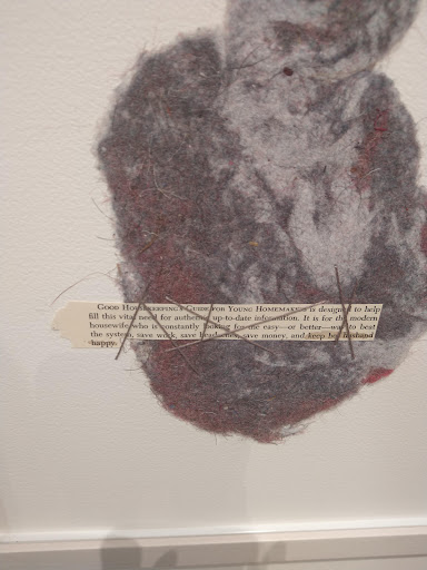 I enjoyed the exhibition so much. There are so many ways to interpret "Ritual," and it was fascinating to see what folks had created. One piece was what looked to be pieces of dryer lint, framed, with quotes from an old-fashioned book about women's household responsibilities sewn to them. Another was called "Gather," a series of drawings of a family at the table as, through the years, children got older, left, got married, etc. Many religious rituals were used for inspiration, as well as hygiene rituals, marriage and family rituals, etc.