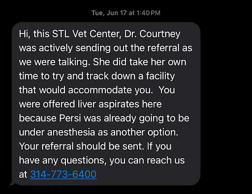 On June 17, while my dog was under anesthesia for her dental cleaning, I got a call asking if I wanted to do a needle aspirate on her liver—despite the fact that I had already made multiple requests for a full biopsy referral. At this point, weeks had passed without any meaningful communication or follow-through from the clinic.