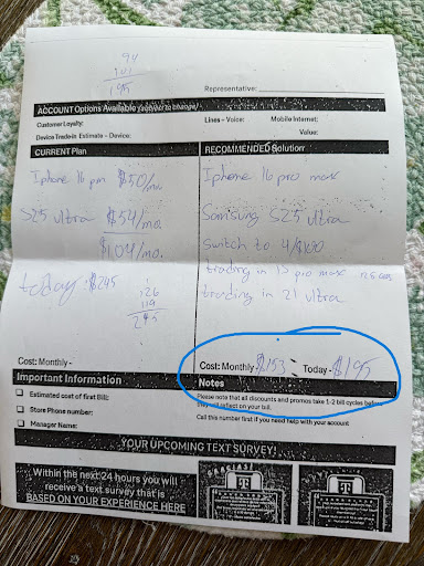 I have 2 paid off phones and was looking for upgrades. My last bill was about $130. Keeping the same plan, and upgrading my phones would change my bill to about $245. But, he could give me a promotion that if I added 2 more phone lines the total would be $153. So for only $20 a month more, I would have upgraded phones and 2 more lines. Sounds good right? (I should have thought too good). So I took the deal.