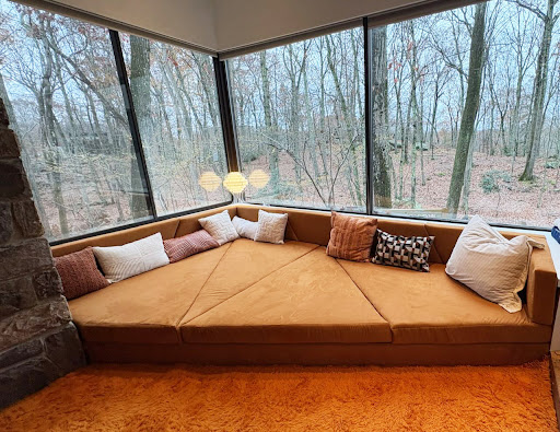 We have a large built-in couch and daybed in our 70’s conversation pit that had all-original upholstery and cushions that needed updating (over 30 cushions), as well as the “under” support cushions, and bottom and top frame fabric. After reading all the amazing google reviews, I called Little Joe’s, and Marie couldn’t have been more helpful. She actually drove around with me to three separate local fabric outlets to try and find the best solution (we were pretty particular about what we wanted).