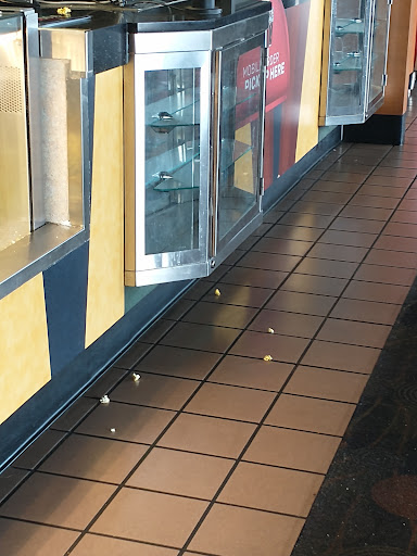 Upon entry you're greeted with dark carpet, solid black walls, dirty, grimey glass and chrome here and there, and a rundown "arcade" with 3 claw machines and a star wars game - two of which are out of order. The floor is littered with specs of paper, popcorn and kernels, and soda stains.