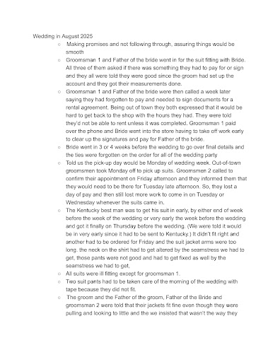 Read moreI wanted to support a local business so I went with them for my wedding party suit rentals. Every time I met with them there was a new mistake that they needed to correct. On the wedding day there were still more mistakes, a groomsmen had the wrong color vest, wrong tie, another missing their button clips and a third with pants at least 6in too big. I recommend the business double check things and write stuff down because the amount of mistakes...
