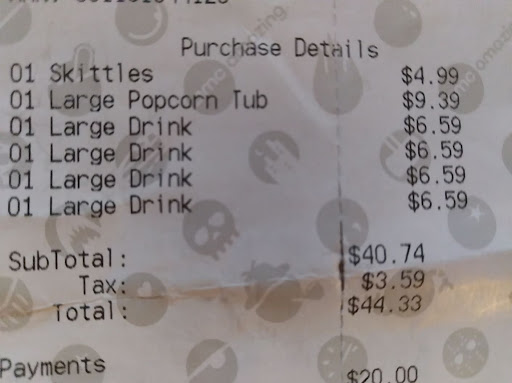 Read more4 large drinks, 1 large popcorn and 1 candy $44.33 !!! Popcorn has been downsized. says "tub" on receipt....it was a med size bag. So they give you even less, but charge more. The gouging has gotten so out of hand that I will never buy another concession item from AMC ever again in my life. I was absolutely floored at the prices, and it was not worth it. Then to add insult, they hand you a paper straw which collapsed by the end of the movie. Half of the flavors were out in coke machine, butter dispensers not working. If I'm paying that much for concessions, you better up your game by MILES!! just chairs don't do it no more. I want bathroom attendants, and a bathroom that does not look like a rest station crack house. I want Chik-fi-la service with a " my pleasure" and a smile at ALL times. The prices were not worth the show. Even came from Cushing to see Spiderman with 5 family members. Should have gone to the Dunkin Theater in Cushing . Oh yea....but the seats were nice?! Lol That was the only positive experience other than the movie itself. Does not balance. If you're lucky!! You might be there on $12 beer night!! Lol ......I'm done. All in all, I expect it to be slightly over priced, because I understand how movie theaters make money. But the hand has overreached at AMC theaters. I didn't even go all out and just casually order for the family. I had to strategically order only a few things and it still cost me 2 steak dinners to buy 1 bag of popcorn, 4 drinks, and skittles. That does not seem to be family friendly at all. Guess I'll have to start doing things like I did when I was a younger going to the movies. Get my candy and sodas...