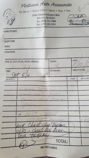 Horrible place!!Had a Bluetooth, amp and speaker installed.They finished the job called me out to show me everything.They couldn't due to my ac being knocked out during the time of installation.I went back inside called me back out.No one knew how to program the Bluetooth to my phone.Finally one of the guys that use to work there.Just so happened to stop by.He was able to fix it.After leaving the shop i noticed my music wasnt putting out.like it was suppose to.Also my middle console side piece was shattered to pieces.After returning 5 min later i confront the Gentleman behind the counter and ask him about the damage.Of course he tells me it was already like that.My radio system he had no idea why it was not playing as loud as it should have.Will never ever return.The next Day I took my Vehicle to "Fly"Mays 519 Customz on Covington Highway.They repaired everything .Great deal Super professional.Platinum Auto the two guys that did the horrible job on my truck were the owners and they're liars.How can you be my Grandparents age and still lie about simple things.Instead of owning up to...
