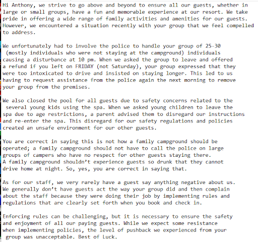 Use to be a fan of this campground when phil visited it and the staff hiring was managed by someone who cared about the campground and it's families. We recently stayed there and at 9:15pm a staff member drove by and told us it's quiet time in 45 minutes which we knew since we have visited the campground at least a dozen times. The staff member also told us that our kids were speeding around the campground on their bikes, what he didn't tell us is that he was swearing at the kids telling them to get the ** off the bikes before he takes them, brought it to the staff member when he came back and he said he didn't know who said that. The kids confirmed it was indeed the staff member and he should have a dashcam footage of it, talked to another staff member (the only sane one there) and he mentioned that he is the one who was swearing at the kids and he also has the ability to turn off the dashcam. At 10:30 the security guard came back and told us to be quiet, we had already turned off the music at this point and were just talking at the table, mind you that every other site around was doing the same thing and some louder then us. He came back very aggressive towards me and started staring me down, I had my kids there so did not do anything except ask for a manager. The manager came down and told us to shut up or hes going to call the cops, and at this point there were nobody was yelling. I told him if that's what you need to do then call them we aren't doing anything wrong. Fast forward 15 min later 4 cruisers came down and started off at first being very agressive and asked for licenses to run names, why? no idea... but everyone who was asked complied respectfuly. The staff told the police we were being loud and the cops bascially told us to quiet down and left, they also told the security in question to stay away from us. No other issues that night, in the morning we woke up to a knock at the door with 4 cruisers again telling us our group had to pack up and leave we were being kicked out (2 campers, 3 cabins) we left without an issue as we were planning on leaving anyways after being treated like that. The manager also told us he would refund everyone for the full stay if we left in the morning which he did not, so currently pursuing that. I am in the process of getting body footage from the officers and will seek legal action. We aren't sure if this was racially motivated or something else but we are going to find out.