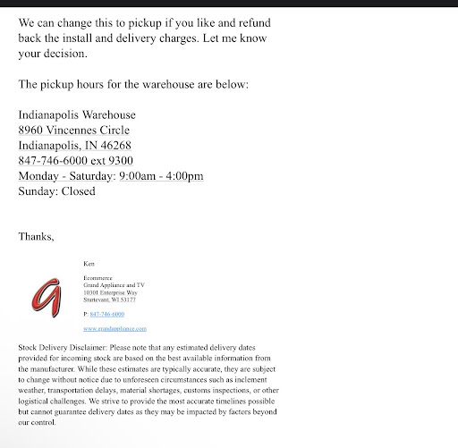 Read moreI originally had high hopes for this company. Before I purchased my cooktop on Monday, I spoke with a real person who told me that it would work and that it would like be installed before Friday of this week. After I purchased it, I got an email from the same guy I spoke with in the chat saying I can have it delivered and installed on Wednesday. I was ecstatic. Tuesday afternoon I got a call from a lady to tell me this location doesnât deliver or install on Wednesdays and the best she could do is Saturday. She was a little rude but in her defense, so was I. I told her I had double confirmation from two separate people that it would be Wednesday. She refunded me $80 for this mishap and I scheduled for Saturday. But I really needed it installed before Friday. So I reached back out by email and asked if I could pick up the product. The guy, Ken said yes and sent me the address to the Indianapolis warehouse AND their hours of operation. Mon-Saturday: 9-4 and CLOSED: on Sunday.