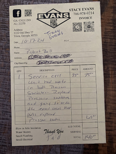Read moreI can’t complement Evans enough! They are awesome. I had a issue with my hvac unit a month ago and with in 24 hours of me calling they came out and got it working. Well I had another issue with it a few days ago. They came out with in 24 hours again and were able to tell me exactly what the issue was in 10 minutes. They took great care of me and would recommend them to...