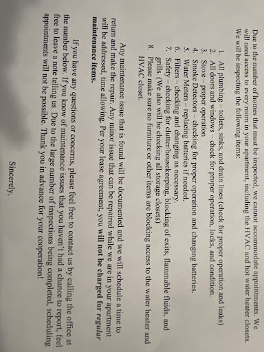 Meanwhile the Gallery is silent. No apologies, no discounted rent, no solution. Instead they decided they need to enter every apartment for inspection and will not be able to provide time slots for when inspection will take place. Yeah that's right, if you're at work or busy they do not care, they will enter your property anyways and invade your privacy. I was told I would get a visit in 5-10 minutes after receiving a phone call. I called back after 60 minutes and said hey I have work stuff, and personal tasks I need to do, what's the deal with the wait. I was provided no great answer and told I could go about my business with work. Excuse me for not wanting to be interrupted during my job promotion interview. This is exactly what I'm talking about, they have no regard for your daily important tasks. As if having 3-4 people enter my apartment while in a zoom call wonât impact my focus and performance. Little to say it took hours for this inspection to arrive. These people have no respect for their residents. Let's also make it clear, this is the 3rd time fire has entered my apartment in 3 months and when fire is not entering, maintenance is to check the HVAC systems (Happened twice in 4 months). Therefore if you want any type of privacy in your apartment complex this is complete NO. It is crazy that nearly ½ of my floor has ring cameras because they are seriously concerned with what individuals are coming in and out of their apartment when they are not home. They run this place like a college dorm, not people's homes. Personally I leave valuables sitting around my apartment, it's crazy to think people who are not employed by the Gallery are given access and could easily scoop an item up. And yes when they did finally arrive, it was two workers not employed by the Gallery, not even being escorted by maintenance which is supposed to be their policy.