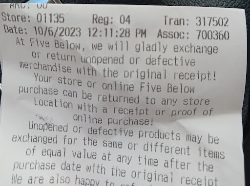 Ā Ā Ā Read moreHad really bad experience Price of the product was 4$ on display she did not wanna match. And when she did for 5 of them and I wanted 17 of the pcs. I had to buy on $5.55 regular. She was that upset about that and started to throw them in the bag recklessly. Upon asking to do it nicely she did it more recklessly. And all four ladies were busy making fun. I felt very very disappointed š I wouldnāt go back ever and would recommend her. Or store associate number 624094 on 1/1/2024 time 5:25:28 pm I hope the five below management...
