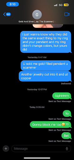 Fake Gold!!! My boyfriend and I bought a matching set and the guy that was selling it to us stated that it was 10 karot gold and HANDMADE with crystals. After a day, the “gold” started coming off. My boyfriend was not happy about it, so he went to the pawn shop to check if it’s real. IT’S NOT REAL!!! Also, the color in between each “crystal” is also FADING. Scammers and I am disappointed. Mine is the one with the lion on top and my boyfriend’s is the one on the bottom. See the difference in between the colors? And it has only been a day. I barely wore mine too, he has been wearing it throughout the day. Don’t buy from them and...