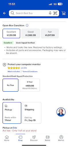 Ā Ā Ā Read moreService sucks! I ordered a Samsung Galaxy watch 7 from samsung which is back ordered. So i ordered it with a trade of my current watch. 100.00 Then someone told me best buy had it in stock and you get a free band. So i went to best buy in erie pa. I asked for help. The employee Gina helped me. I asked her, do i get the same deal as Samsung, she said yes but you also get a free watch band. So in front of her i said if i can cancel my order with Samsung I'll buy it here. I was able to cancel it. So she proceeded to ring up my watch. Now im told i cant give you the band cause it is sold out. So i asked if I can get it when it comes in. Certainly she said. So I said okay proceed with the purchase. Then she said the sale won't go through unless we take the watch band off so I'm not going to be able to give you the watch band. I told her to proceed and I'll take it without the watch band. She then said it will not allow me to give you the trade-in it will only allow $15 so now the order is $170 more than what I was originally told after I already canceled my other order through Samsung. They would not honor the trade-in nor would they give me a band. Both of which is on their website and the person waiting on me told me said I would get both. So now i paid full price, with no trade and no band. Would not honor their advertised deal. I was there over an hour and i was told to contact customer support. I did that only to be on hold for 20 minutes then the system hung up on me. I did this 4 times. Then i gave up. So i tried to call and speak with a manager of the store. Again on hold for 20 minutes then i was transfered to customer service where i was told they can only help me if i wanted to place an order. Now i am out of luck through samsung as i canceled my order amd i left the store with nothing. So that trip so best buy cost me over an hour of my time and 170.00 that i cant redeem. I got nothing.. I will never order or buy anything from...