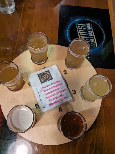 Ā Ā Ā Read moreWe had our first encounter with Eclipse Brewing the day of Riverfest, and it was WONDERFUL! We had pizza..very good! Cindy had wine..very good! I had Scottish Ale and English Ale. As a side note one of my great disappointments about many craft brewers is their tendency to try to āout hopā each other with the result being bitter, way too bitter! These two, Scottish and English, are in my opinion, the best ale I have ever tasted.....and Iāve had a āfew.ā Last, our waitress was perfect, engaging with a sly sense of humor, punctuality perfect also...to me that counts for two of the stars alone. We canāt wait to try a few of the other brews and...