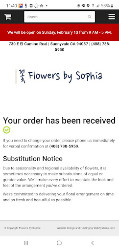 Read moreWorst experience as a costumer I have ever had , I was supposed to send flowers to my wife on Valentine's Day I placed an order in the store promised me that the order will be delivered on Valentine's Day. Was never received my wife never received the order and this and I called the store more than a hundred times and didn't receive any reply I also send emails and didn't receive any reply I highly recommend to look for a different place when you want to buy flowers because this is the worst customer service I have ever...
